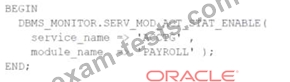 When you enable statistics gathering for a specific service and module using DBMS_MONITOR.SERV_MOD_ACT_STAT_ENABLE, the output is aggregated and can be viewed using theV$SERV_MOD_ACT_STATSdynamic performance view. This view contains the cumulative statistics of database activity broken down by service and module, which is exactly what you collect when executing the provided command. * B (Incorrect):While many types of trace files are located in the Diagnostic Destination directory ( $ORACLE_BASE/diag), the aggregated statistics for services and modules are not written to trace files but are instead viewable through dynamic performance views. * C (Incorrect):TheV$SERVICE_STATSview provides service-level statistics but does not provide the * combined service/module-level breakdown. * D (Incorrect):The output of the PL/SQL block is not written to a file in the current working directory; it is stored in the data dictionary and accessible via dynamic performance views. References: * Oracle Database PL/SQL Packages and Types Reference:DBMS_MONITOR * Oracle Database Reference:V$SERV_MOD_ACT_STATS