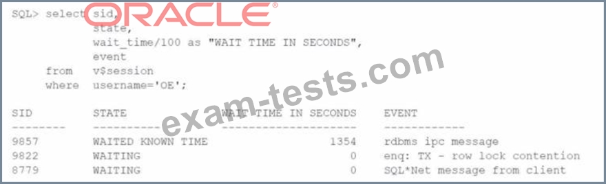For this SQL statement and output, we can analyze the EVENT column to understand the type of wait: B: The event "SQL*Net message from client" typically indicates that the session is waiting for a response from the client. This can be due to a network issue, user response, or an application processing delay. E: The event "SQL*Net message from client" also implies that the session is idle waiting for the client (a user or an application) to send a request to the server. This event usually indicates that the session is not actively working but is instead waiting for the next command. F: The wait event "enq: TX - row lock contention" suggests that session 9822 is waiting for a row-level lock held by another session. If the holding session issues a COMMIT or ROLLBACK, the lock will be released, and session 9822 will stop waiting. Since this session is experiencing row lock contention, it implies it's waiting for a specific transaction to complete. References: * Oracle Database Reference, 19c * Oracle Wait Events Documentation
