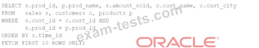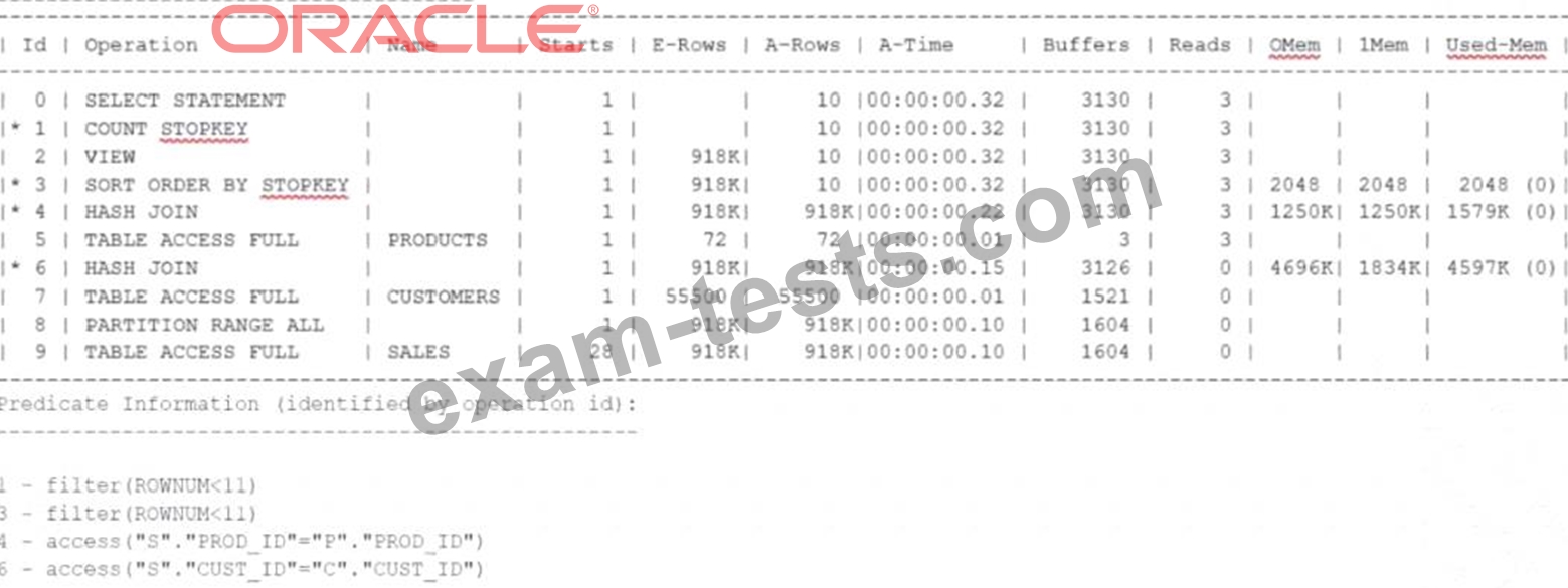 The execution plan shows a full table access for theSALEStable. To reduce the execution time, creating an index onSALES.TIME_IDwould be beneficial as it would allow the database to quickly sort and retrieve the most recent sales without the need to perform a full table scan, which is I/O intensive and slower. By indexing TIME_ID, which is used in theORDER BYclause, the optimizer can take advantage of the index to efficiently sort and limit the result set to the ten most recent sales. * B (Incorrect):ReplacingFETCH FIRSTwithROWNUMwould not necessarily improve the performance unless there is an appropriate index that the optimizer can use to avoid sorting the entire result set. * C (Incorrect):There is no indication that the current statistics are inaccurate; hence, collecting new statistics may not lead to performance improvement. * D (Incorrect):While adaptive plans can provide performance benefits by allowing the optimizer to adapt the execution strategy, the main issue here is the lack of an index on theORDER BYcolumn. * E (Incorrect):Creating an index onSALES.CUST_IDcould improve join performance but would not address the performance issue caused by the lack of an index on theORDER BYcolumn. References: * Oracle Database SQL Tuning Guide:Managing Indexes * Oracle Database SQL Tuning Guide:Using Indexes and Clusters