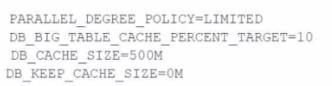 Big Table caching is a feature that allows frequently accessed large tables to be cached in memory to improve I/O performance. From the parameter settings provided, Big Table caching is not occurring because DB_BIG_TABLE_CACHE_PERCENT_TARGET is set to 10, which is the minimum threshold for enabling the feature, but the size of the cache is too small for the big tables to be effectively cached. To enable Big Table caching, one of the following actions could be taken: * C (Correct): Increasing DB_BIG_TABLE_CACHE_PERCENT_TARGET to at least 25. This action would allocate a larger percentage of the buffer cache for storing big tables, which could allow for caching large tables and thus improve I/O performance. * D (Correct): Increasing DB_CACHE_SIZE to 1G. Since the size of the buffer cache is a determining factor for how much data can be cached, increasing this parameter would provide more memory space for big tables to be cached. Options A, B, E, and F will not enable Big Table caching because: * A: Increasing DB_BIG_TABLE_CACHE_PERCENT_TARGET to 50 without adjusting the overall size of the cache might still not be sufficient if the DB_CACHE_SIZE is not large enough to hold the big tables. * B: Setting DB_KEEP_CACHE_SIZE to at least 50M only specifies a separate buffer pool for objects with the KEEP cache attribute and does not affect Big Table caching. * E: and F: Changing the PARALLEL_DEGREE_POLICY to ADAPTIVE or AUTO influences the behavior of parallel execution but does not directly enable or influence Big Table caching. References: * Oracle Database Performance Tuning Guide: Big Table Caching * Oracle Database Reference: DB_BIG_TABLE_CACHE_PERCENT_TARGET * Oracle Database Reference: DB_CACHE_SIZE