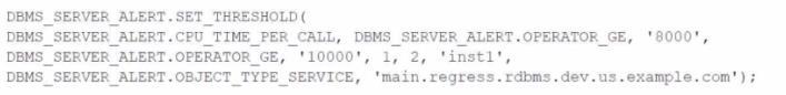 DBMS_SERVER_ALERT.CPU_TIME_PER_CALL, DBMS_SERVER_ALERT. OPERATOR_GE, '8000', DBMS_SERVER_ALERT.OPERATOR_GE, '10000', 1, 2, 'inst1', DBMS_SERVER_ALERT.OBJECT_TYPE_SERVICE, 'main.regress.rdbms.dev.us.example.com') ;