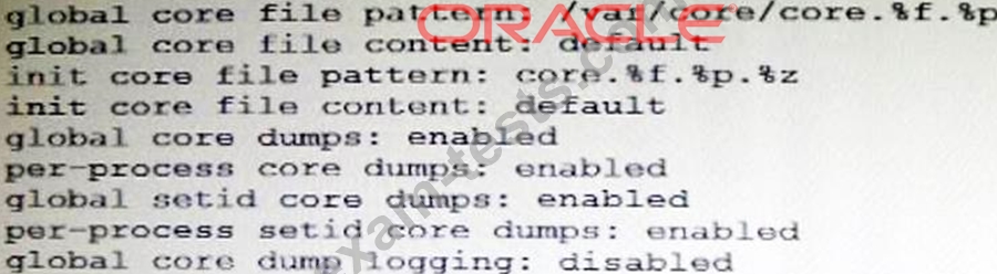 Note the first line: global core file pattern: /globalcore/core.%f.%p The program name is bash The runtime process ID is 2663 Note: By default, the global core dump is disabled. You need to use the coreadm command with the -e global option to enable it. The -g option causes the command to append the program name(%f) and the runtime process ID (%p) to the core file name.