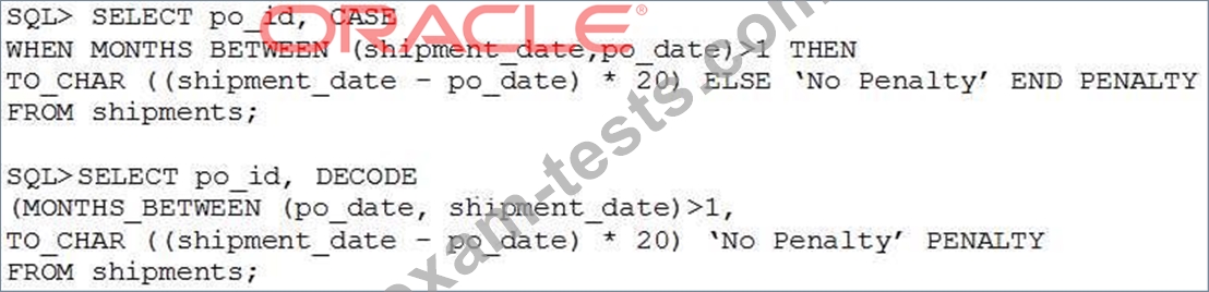 You want to generate a report that displays the PO_IDand the penalty amount to be paid if the SHIPMENT_DATEis later than one month from the PO_DATE. The penalty is $20 per day.
