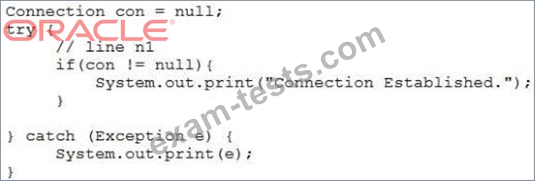 Which code fragment can be inserted at line n1to enable the code to print Connection Established?