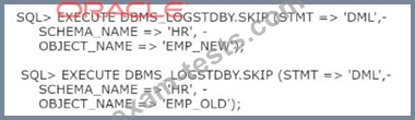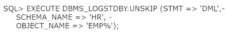 The execution of the UNSKIP procedure is designed to remove SQL Apply filters that have been previously set up on a logical standby database. Based on the provided statements, the UNSKIP procedure is directed to delete any SQL Apply filters for DML statements associated with objects in the 'HR' schema that start with 'EMP'. Since both SKIP procedures had the same schema name ('HR') and statement type ('DML'), and the UNSKIP procedure uses a wildcard (%) for the object name, it will successfully remove both of the SQL Apply filters for 'EMP_NEW' and 'EMP_OLD', as both object names match the pattern provided in the UNSKIP procedure. References:Oracle's Data Guard documentation and SQL Language Reference provide insights into managing SQL Apply filters on a logical standby database using the DBMS_LOGSTDBY package. This includes adding and removing filters through SKIP and UNSKIP procedures.