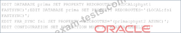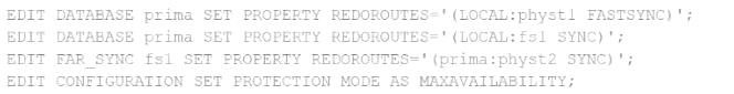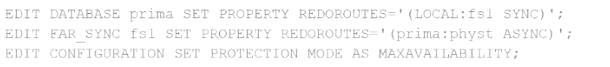 A customer has these requirements for their proposed Data Guard implementation: 1. Zero data loss must still be guaranteed through the loss of any one configuration component. 2. The primary database must be protected against a regional disaster. 3. Performance overheads on the primary should be minimized as much as possible given these requirements. 4. Downtime on the primary database for any reason must be kept to a minimum. Components referred to in the broker commands are: