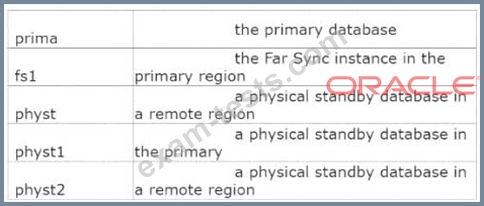 According to the requirements stated: * Zero data loss must be guaranteed despite the loss of any one component: This necessitates synchronous redo transport to at least one standby database (for no data loss). * The primary database must be protected against a regional disaster: This implies that there must be a standby database in a different region. * Performance overhead on the primary should be minimized: This suggests that asynchronous transport should be used where possible to reduce the performance impact on the primary. * Downtime on the primary for any reason must be kept to a minimum: This is indicative of a requirement for a fast failover mechanism, possibly with a fast-start failover (FSFO) and high availability. Given these requirements, the appropriate option that fulfills all these is: * Option C, where 'prima' is the primary database, 'fs1' is the Far Sync instance in the primary region, and 'physt' and 'physt2' are physical standby databases in the primary and remote regions, respectively. In this configuration: * 'prima' is set to send redo to 'fs1' using SYNC to guarantee zero data loss. * 'fs1' is set to send redo to 'physt' (local standby) using FASTSYNC, which is a low-latency synchronous transport that is optimized for performance. * The Data Guard configuration's protection mode is set to MAXAVAILABILITY to provide the highest level of data protection that is possible without compromising the availability of the primary database. This configuration ensures that there is zero data loss even if the primary region is completely lost, maintains performance by limiting the synchronous transport to the local region with a Far Sync instance, and has a remote standby database in a separate region for disaster recovery purposes. References: * Oracle Data Guard Concepts and Administration * Oracle Data Guard Broker documentation