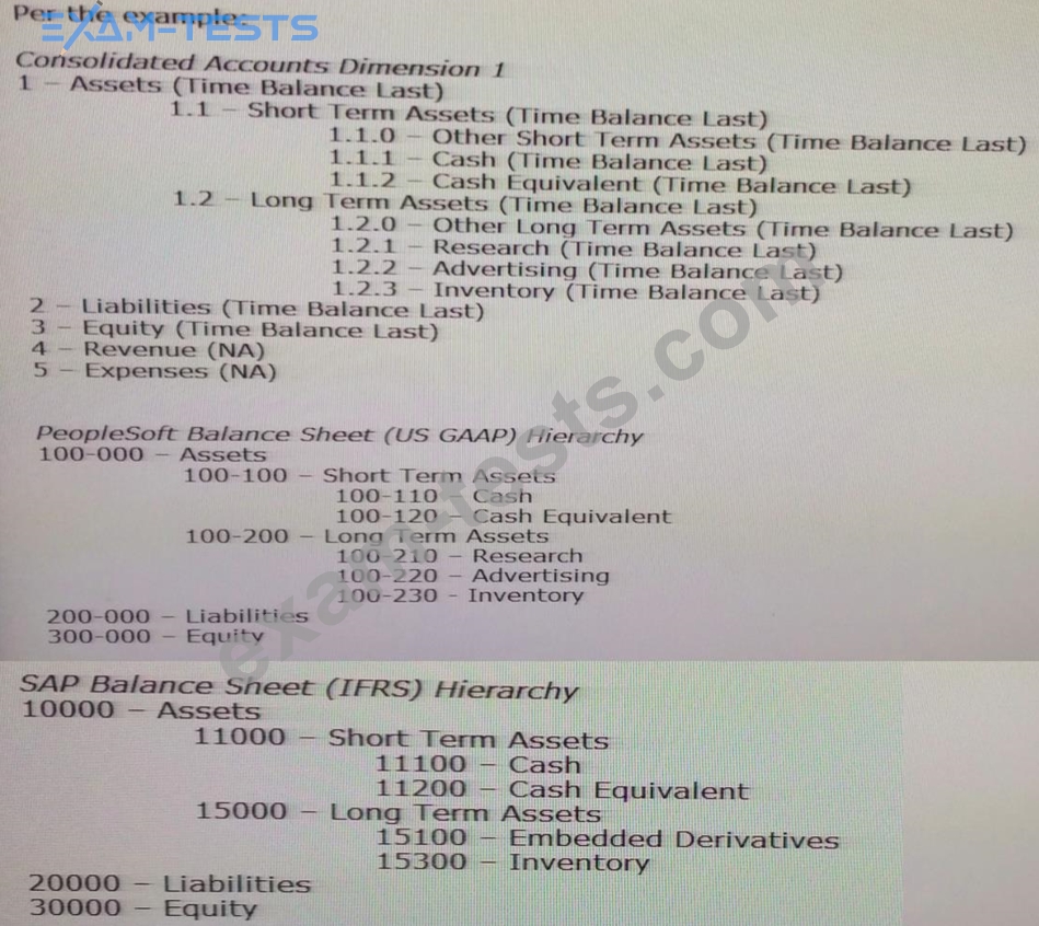 Your organization has two ERPs: PeopleSoft (PS) and SAP. Each ERP has its own chart of accounts. Each chart of accounts is mapped to a consolidated chart of accounts. The