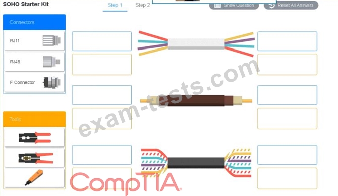 Use the appropriate cables. cable ends, tools and equipment to configure the network ana connect an components accordingly There are 3 steps and the simulation starts on step 1.