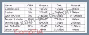 4GB of RAM. a four-core 3GHz processor, and a SATA I 54O0rpm 300GB HOD. The technician logs the following process information: