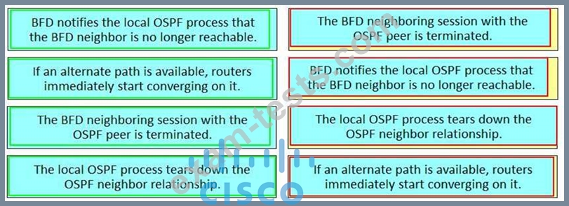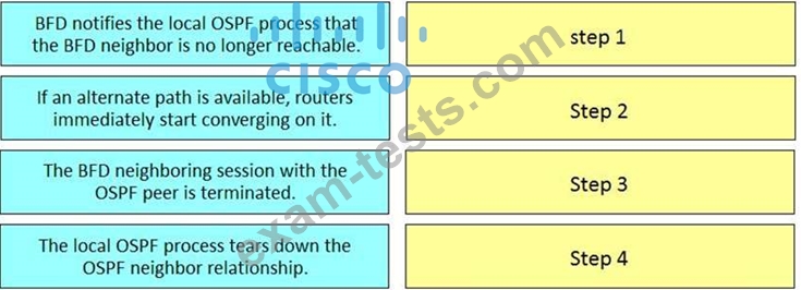 A failure occurs on the network between two BFD and OSPF neighbors. Drag and drop the protocol actions from the left into the correct order on the right.