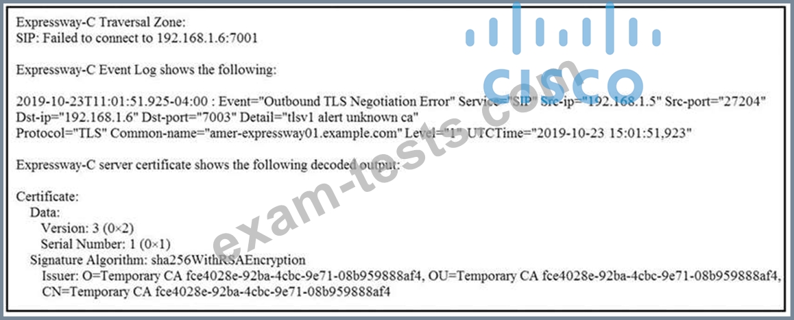 An Expressway-C and Expressway-E are configured for B2B calling and the Expressway- E zone is set to TLS Verify Currently, calls do not reach the Expressway-C. The Traversal Client zone on the Expressway-C for B2B reports the information in the exhibit for the Peer 1 address.
