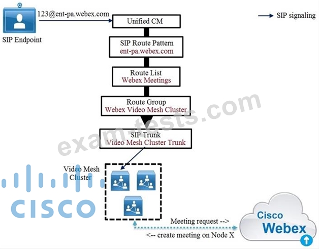 Cisco Unified Communications Manager routes the call via the Webex Meetings route list and route group to the Video Mesh cluster Node#1 in the Video Mesh cluster is hosting the meeting and has reached full capacity, but other nodes in the cluster still have spare capacity.