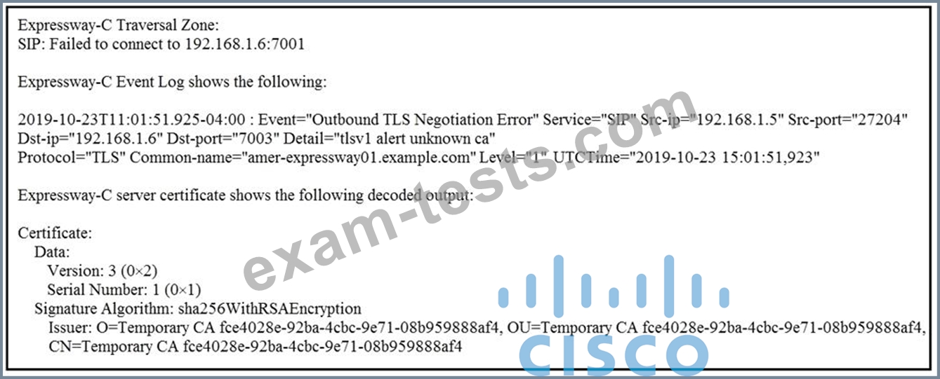 An Expressway-C and Expressway-E are configured for B2B calling and the Expressway- E zone is set to TLS Verify Currently, calls do not reach the Expressway-C. The Traversal Client zone on the Expressway-C for B2B reports the information in the exhibit for the Peer 1 address.