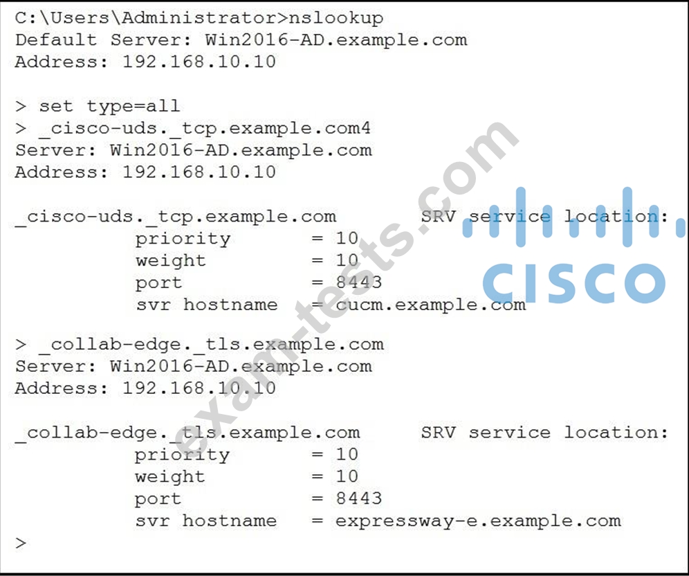 When a Jabber user attempts to connect from outside of the organization, the user enters the login information as "[email protected]" and receives the error "Cannot find your services Automatically". The engineer tries to resolve SRV records used by Jabber.