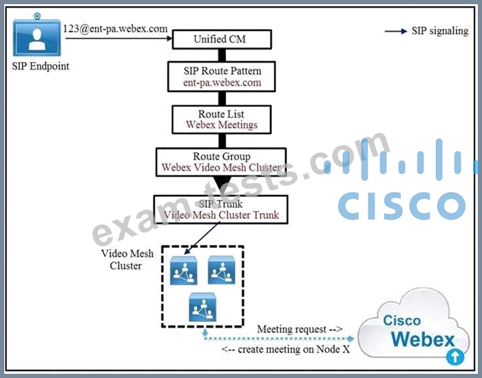 Cisco Unified Communications Manager routes the call via the Webex Meetings route list and route group to the Video Mesh cluster Node#1 in the Video Mesh cluster is hosting the meeting and has reached full capacity, but other nodes in the cluster still have spare capacity.