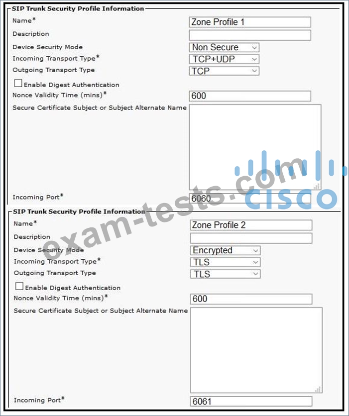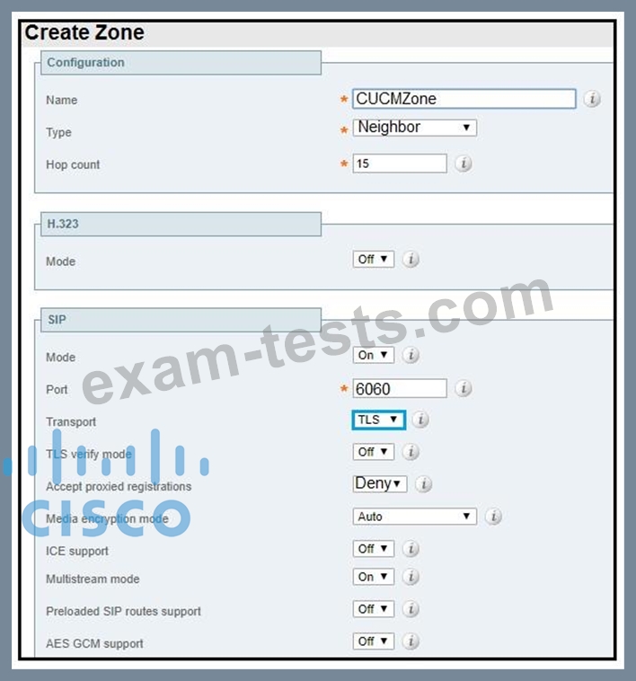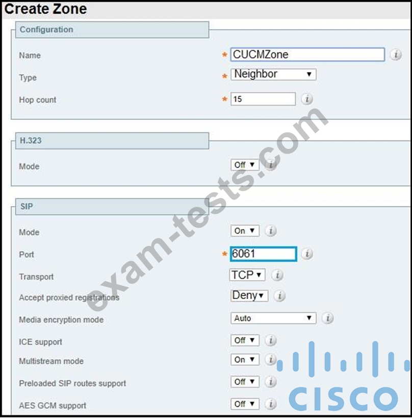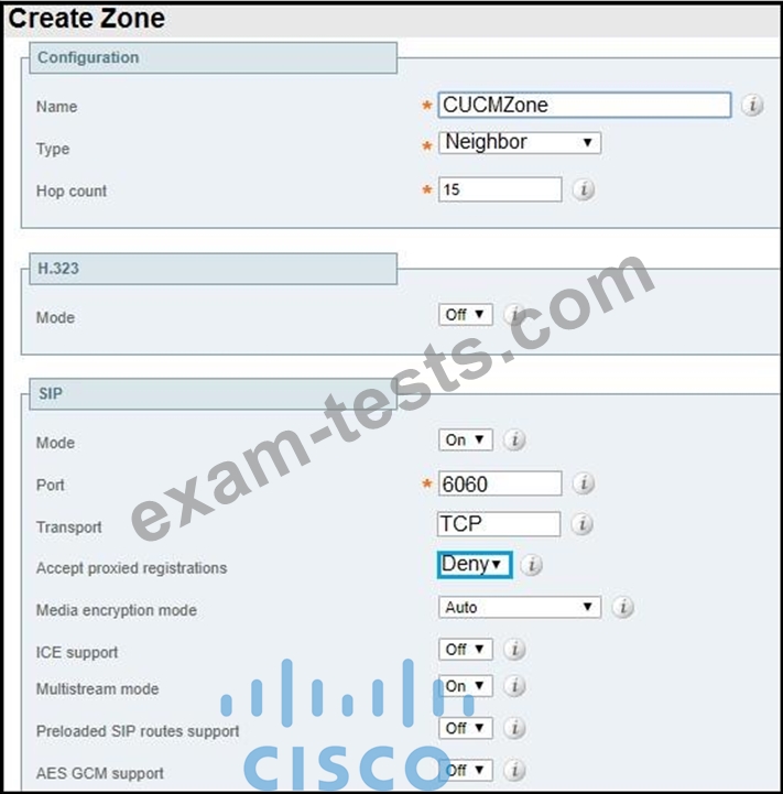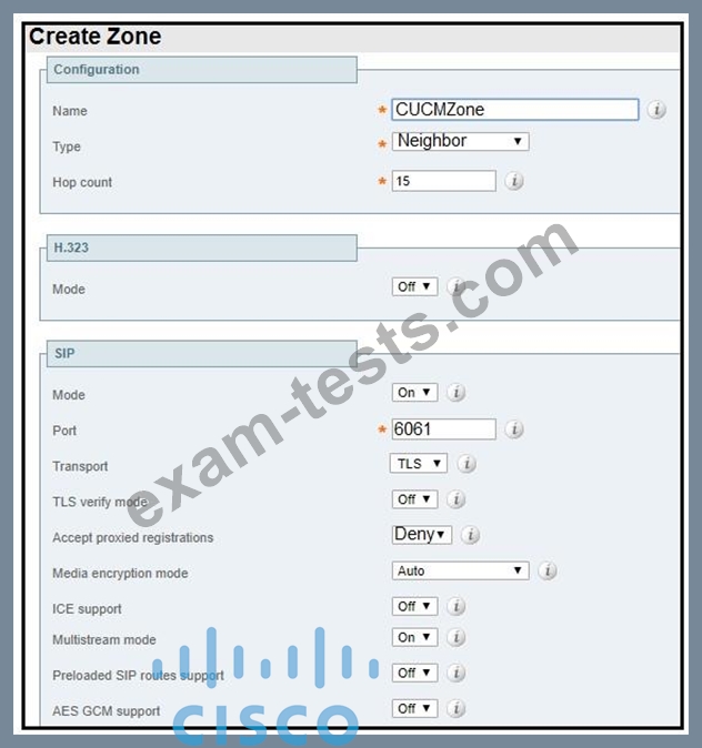 Refer to the exhibit. A collaboration engineer is configuring Cisco Expressway for B2B calling. The engineer must allow inbound calls to be routed to Cisco UCM. The traffic must be unencrypted between the Expressway-C and the Cisco UCM cluster. Which configuration correctly implements the zone?