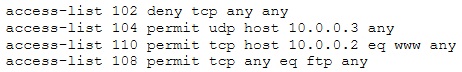 The security administrator of ABC needs to permit Internet traffic in the host 10.0.0.2 and UDP traffic in the host 10.0.0.3. He also needs to permit all FTP traffic to the rest of the network and deny all other traffic. After he applied his ACL configuration in the router, nobody can access to the ftp, and the permitted hosts cannot access the Internet. According to the next configuration, what is happening in the network?
