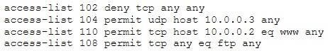 The security administrator of ABC needs to permit Internet traffic in the host 10.0.0.2 and UDP traffic in the host 10.0.0.3. Also he needs to permit all FTP traffic to the rest of the network and deny all other traffic. After he applied his ACL configuration in the router nobody can access to the ftp and the permitted hosts cannot access to the Internet.