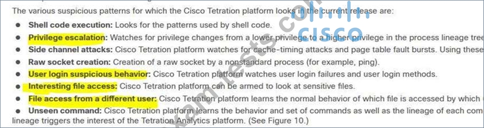 Drag and drop the suspicious patterns for the Cisco Tetration platform from the left onto the correct definitions on the right.