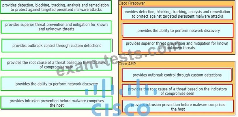 Drag and drop the capabilities of Cisco Firepower versus Cisco AMP from the left into the appropriate category on the right.