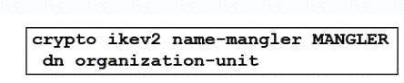 The configuration snippet in the image is a part of IKEv2 configuration where the name mangler is associated with the organizational unit (OU) "MANGLER". In Cisco's IKEv2 implementation, this specific configuration means that only an IKEv2 peer whose certificate has an OU attribute set to "MANGLER" can establish an IKEv2 Security Association successfully. This is a method of ensuring that only peers with certificates issued to a specific organizational unit can connect, enhancing security by limiting unauthorized access. The name mangler is a feature that allows the administrator to specify a string that must be present in the peer's certificate for authentication. The name mangler can be applied to any certificate field, such as common name (CN), organization (O), or OU. The name mangler can also be used to modify the peer's identity based on the certificate field, such as appending or prepending a string to the identity. The name mangler is configured under the IKEv2 profile using the command crypto ikev2 profile profile-name identity name-mangler name-mangler-name dn field-name. In this case, the name mangler is applied to the OU field of the peer's certificate. The other options are incorrect because they do not describe the effect of the name mangler configuration. Option A is incorrect because the name mangler does not affect the identity matching for the IKEv2 authorization policy. The identity matching is based on the peer's identity type and value, which can be different from the certificate field. Option C is incorrect because the name mangler does not encrypt the OU field of the peer's certificate. The OU field is part of the certificate's subject, which is not encrypted in the IKEv2 messages. Option D is incorrect because the name mangler does not set the OU field of the peer's certificate. The OU field is determined by the certificate authority (CA) that issues the certificate, and the name mangler only verifies or modifies the peer's identity based on the OU field. References : Configuring Internet Key Exchange Version 2, Internet Key Exchange Version 2 CLI Constructs, Tutorial: Setting up a certificate-based IKEv2 VPN connection (RSA)