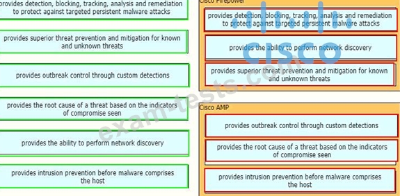 Drag and drop the capabilities of Cisco Firepower versus Cisco AMP from the left into the appropriate category on the right.