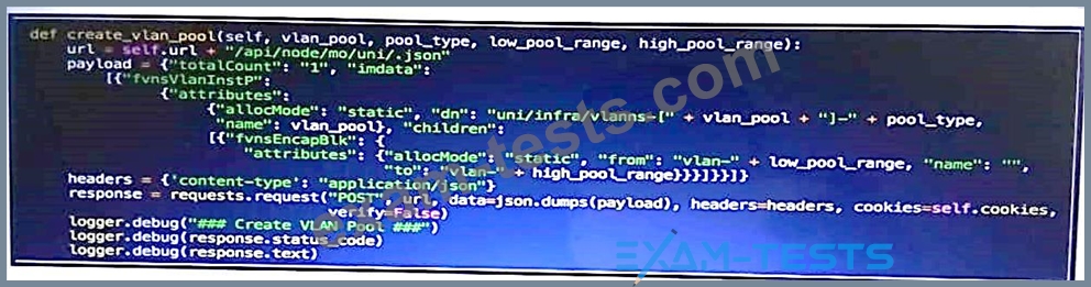 The purpose of this Python function definition is create VLAN pools on ACI solution. Which statement is true?