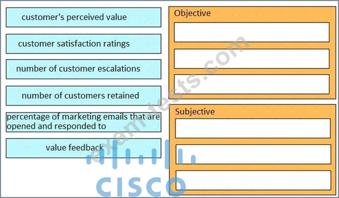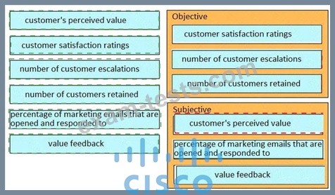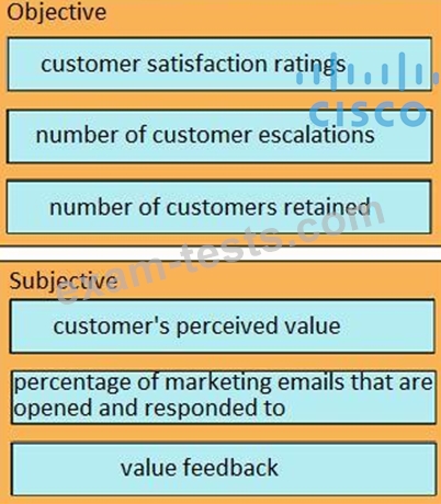 The Customer Success Manager is preparing for a review meeting. The customer has asked for a balance between subjective and objective metrics. Drag and drop the inputs from the left onto the correct subjective and objective categories on the right.