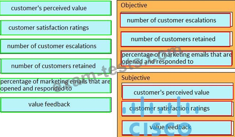 The Customer Success Manager is preparing for a review meeting. The customer has asked for a balance between subjective and objective metrics. Drag and drop the inputs from the left onto the correct subjective and objective categories on the right.