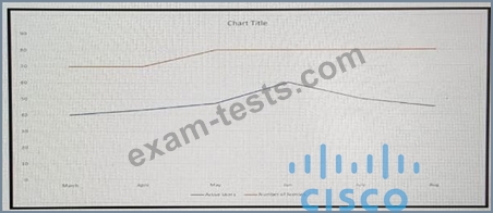 The graph shows a customer with n software product and highlights the number of paid-for licenses (shown with the orange tine) and the number of users actively using the product (shown with the blue line).