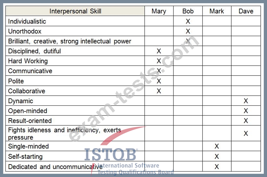 Your test team consists of four members (Mary, Bob, Mark, Dave) with different