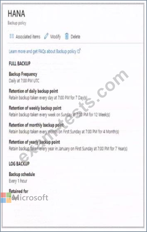 You have a Recovery Services vault backup policy for SAP HANA on an Azure virtual machine as shown in the following exhibit.