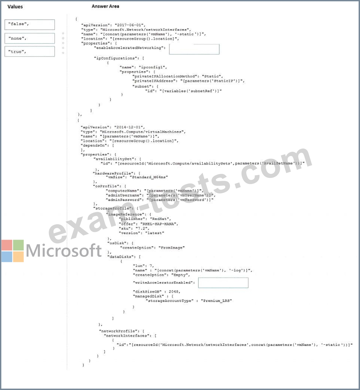 How should you configure Accelerated Networking and Write Accelerator in the template? To answer, drag the appropriate values to the correct targets. Each value may be used once, more than once, or not at all. You may need to drag the split bar between panes or scroll to view content.