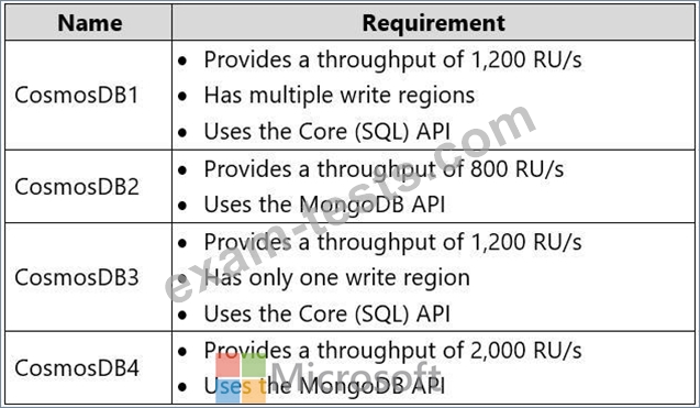 The developers at your company request that you create databases in Azure Cosmos DB as shown in the following table.