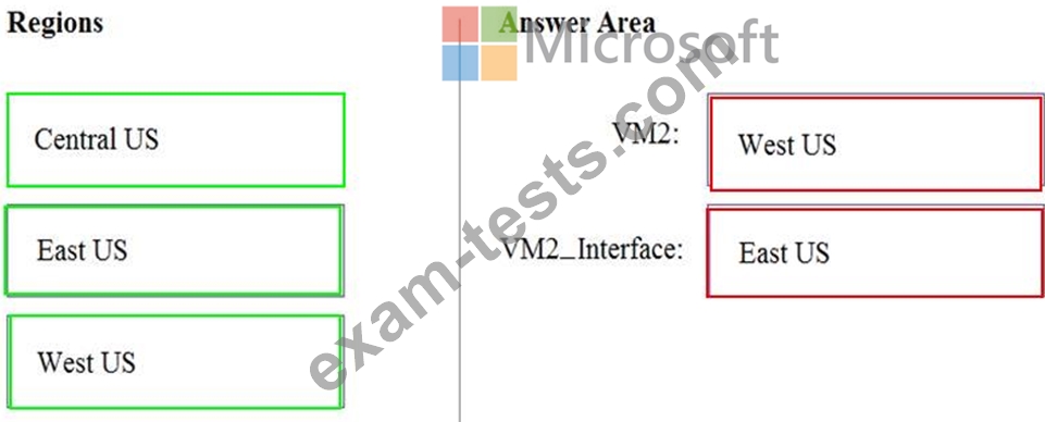 In which region should you create VM2 and VM2_Interface? To answer, drag the appropriate regions to the correct targets. Each region may be used once, more than once, or not at all. You may need to drag the split bar between panes or scroll to view content.