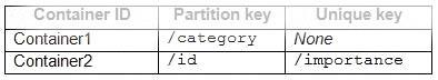 From Azure Cosmos DB, you create the containers shown in the following table.
