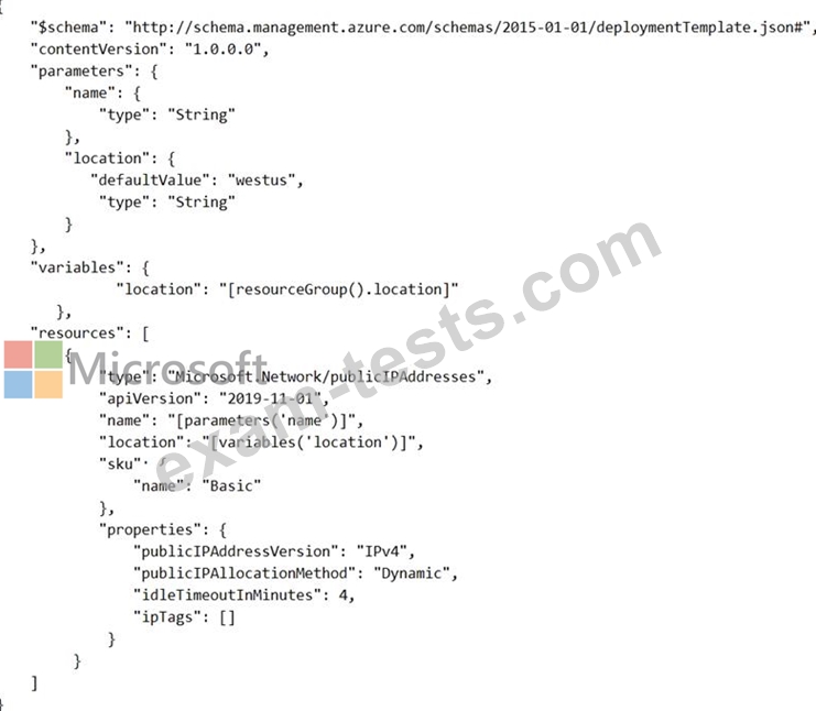 You create an Azure Resource Manager template named Template1 as shown in the following exhibit.