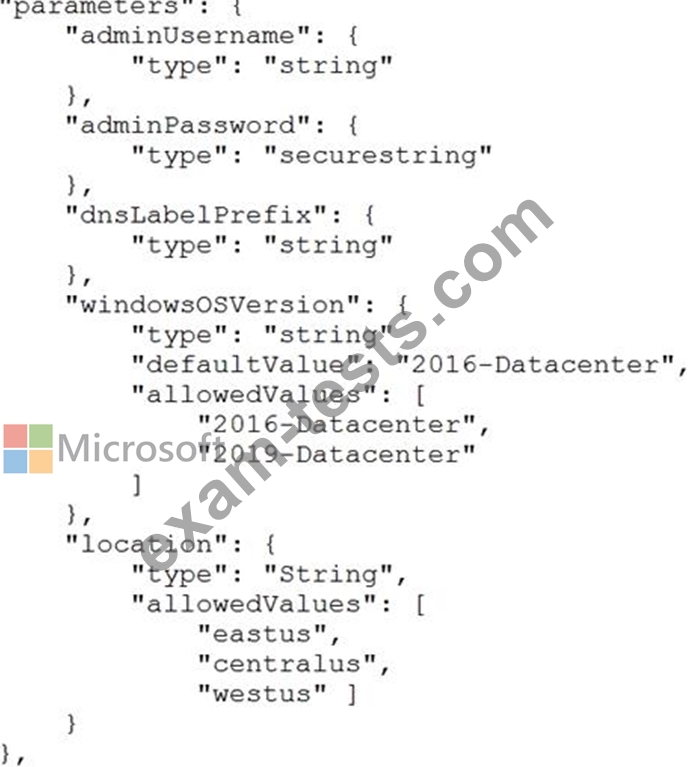 You have an Azure Resource Manager template for a virtual machine named Template1. Template1 has the following parameters section.