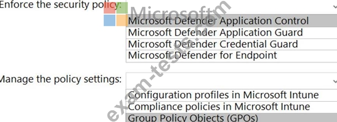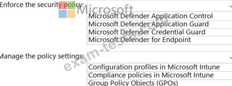 Which service should you use to enforce the security policy, and what should you use to manage the policy settings? To answer, select the appropriate options in the answer area.