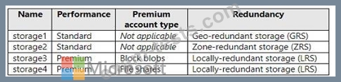 You have an Azure subscription. The subscription contains a virtual machine named VM1 that runs Windows Server. The subscription contains the storage accounts shown in the following table.