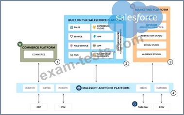 A company plans to adopt Salesforce for a number of their needs, including an internal CRM, a public B2C Commerce storefront with order management functionality, and an extensible API framework to integrate with other systems, as well as marketing automation. The overall system landscape of the proposed solution is shown above.