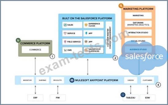 A company plans to adopt Salesforce for a number of their needs, including an internal CRM, a public B2C Commerce storefront with order management functionality, and an extensible API framework to integrate with other systems, as well as marketing automation. The overall system landscape of the proposed solution is shown above.