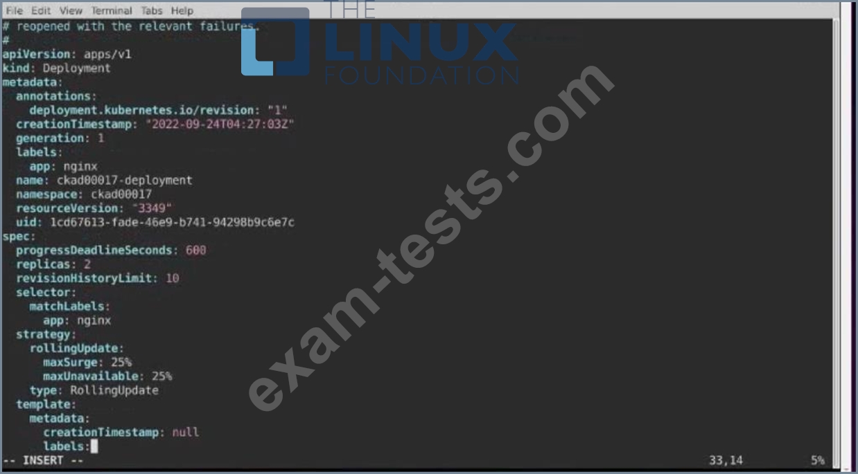 1) First update the Deployment cka00017-deployment in the ckad00017 namespace: