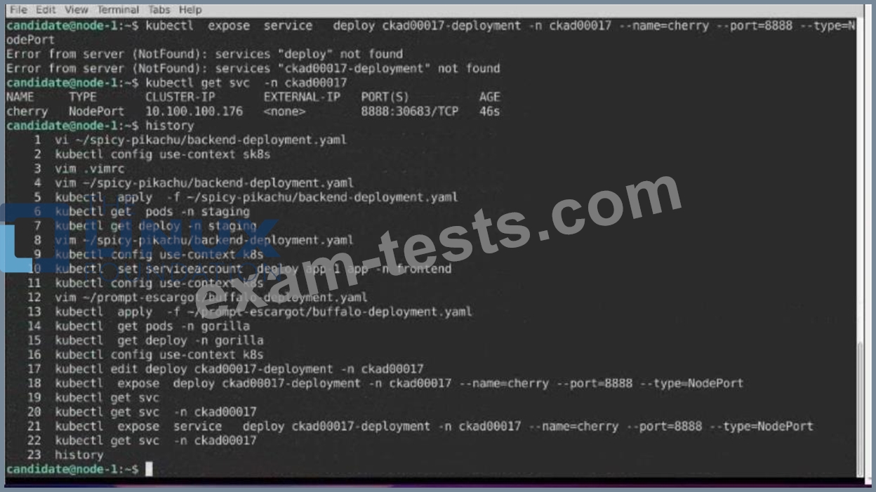 2) Next, Create a NodePort Service named cherry in the ckad00017 nmespace exposing the ckad00017-deployment Deployment on TCP port 8888 See the solution below.