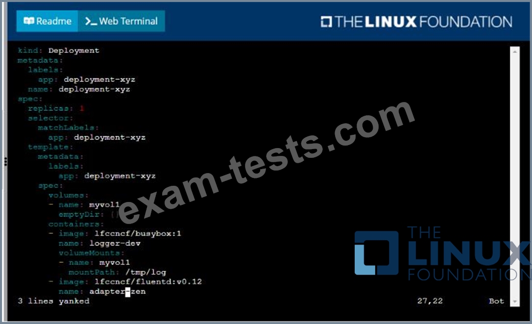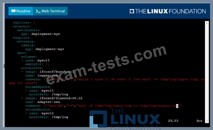 * The adapter-zen sidecar container should read /tmp/log/input.log and output the data to /tmp/log/output.* in Fluentd JSON format. Note that no knowledge of Fluentd is required to complete this task: all you will need to achieve this is to create the ConfigMap from the spec file provided at /opt/KDMC00102/fluentd-configma p.yaml , and mount that ConfigMap to /fluentd/etc in the adapter-zen sidecar container