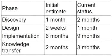 A partner is migrating a client from on-premises to a hybrid cloud. Given the following project status information, the initial project timeline estimates need to be revised: