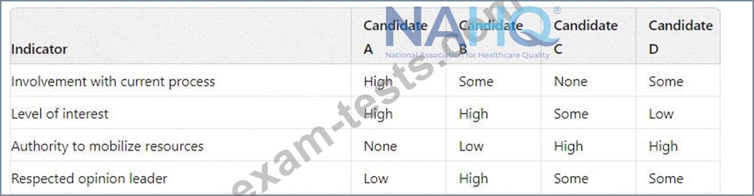 An interdisciplinary team met to review readmission rates at a health system. Issues were identified with communication across care providers. The team is interested in improving the coordination of care process and is now reviewing four candidates to serve in the role of process champion: