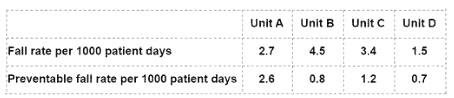 * Based on the data below, which shows the percentage of patients who acquired a hospital-associated infection (HAI) in each unit, the quality improvement coordinator should focus on Unit C, which has the highest rate of HAI among the four units.