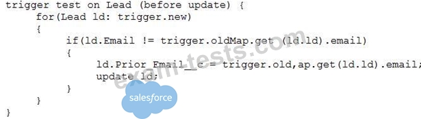 A lead object has a custom field Prior_Email__c. The following trigger is intended to copy the current Email into the Prior_Email__c field any time the Email field is changed: